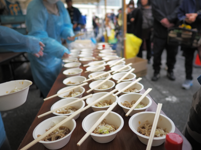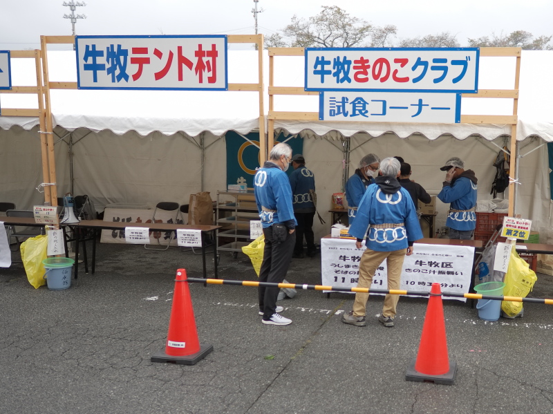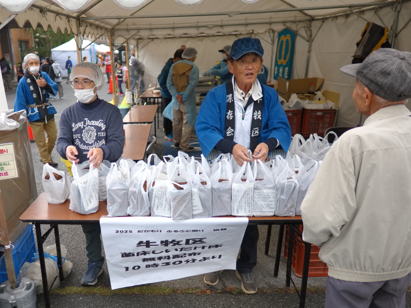 令和7年度まるごと収穫祭、牛牧テント村は蕎麦ときのこ汁、しいたけの菌床の無料配布を実施しました。